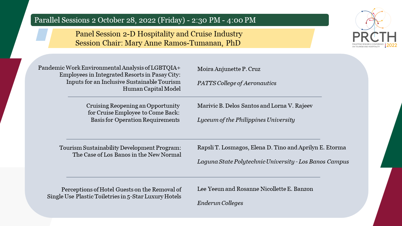 | Pandemic Work Environmental Analysis Of LGBTQIA+ Employees in Integrated Resorts in Pasay City: Inputs for an Inclusive Sustainable Tourism Human Capital Model |